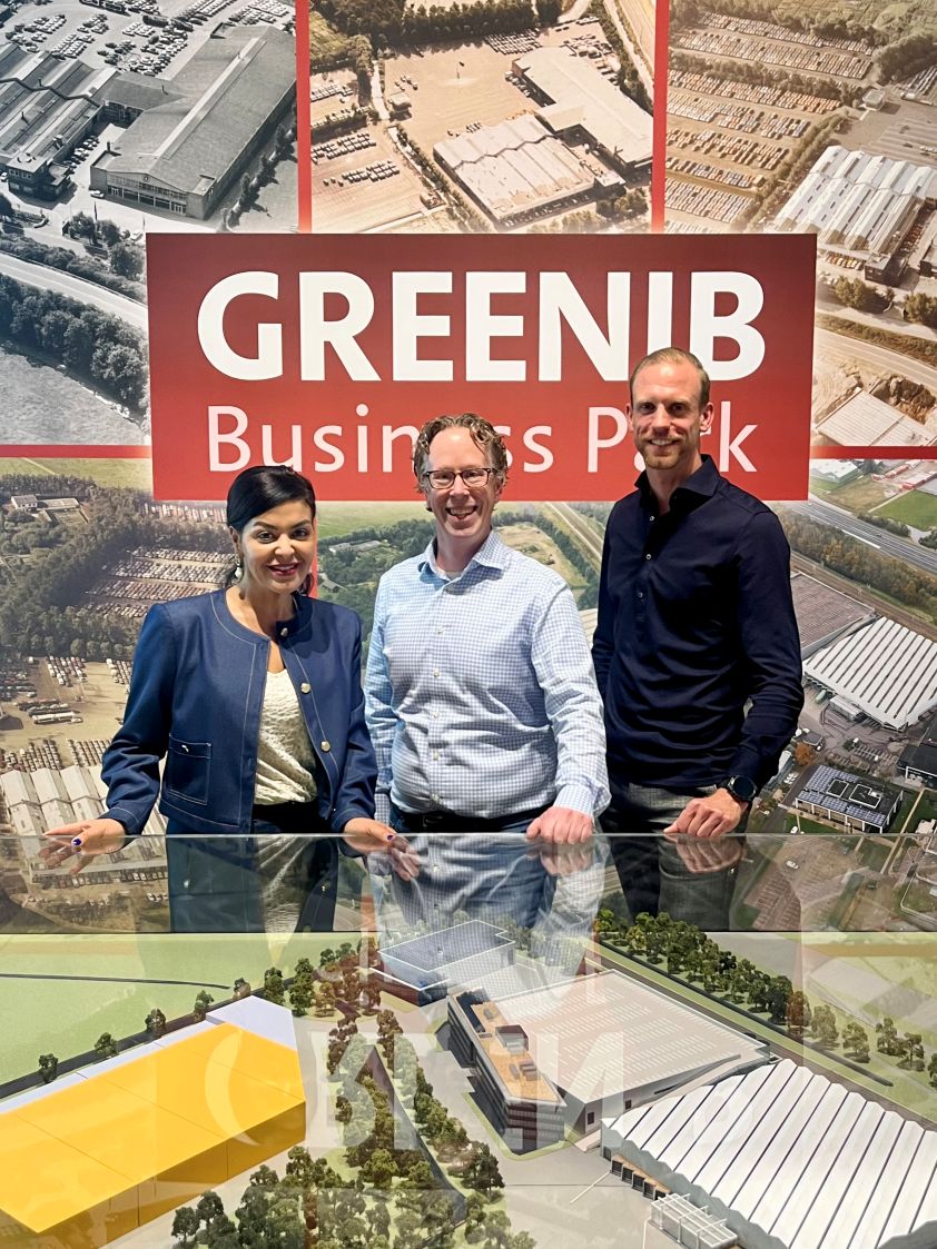 Foto (v.l.n.r.): Fatima Akachaou Acheffaye (Vattenfall), Maarten Muijsson (Greenib) en Arjen Verleun (EE Care) bij de maquette van het Greenib Business Park van de toekomst