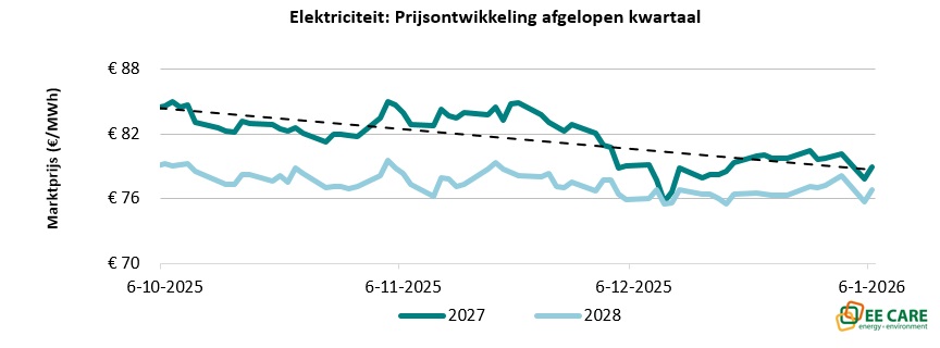 Termijnprijzen voor 2027 en 2028 bleven, over de afgelopen 4 weken gezien, gelijk met €0,079/kWh en €0,077/kWh in de piekuren.