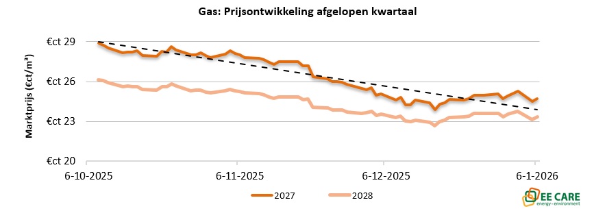 De gasprijs voor 2027 bleef vrijwel gelijk op €0,25/m³. Het jaar 2028 daalde met -1% noteert momenteel ruim een cent lager op €0,234/m³.